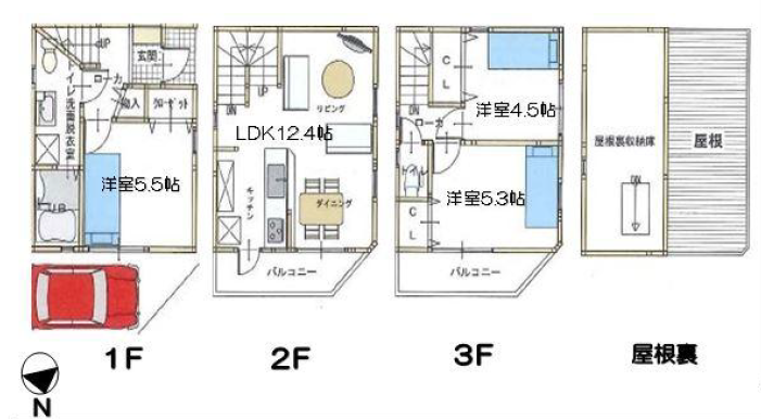 | 間取内容 | 洋室5.5帖 1階 1室洋室4.5帖 3階 1室洋室5.3帖 3階 1室LDK12.4帖 2階 1室 | ||